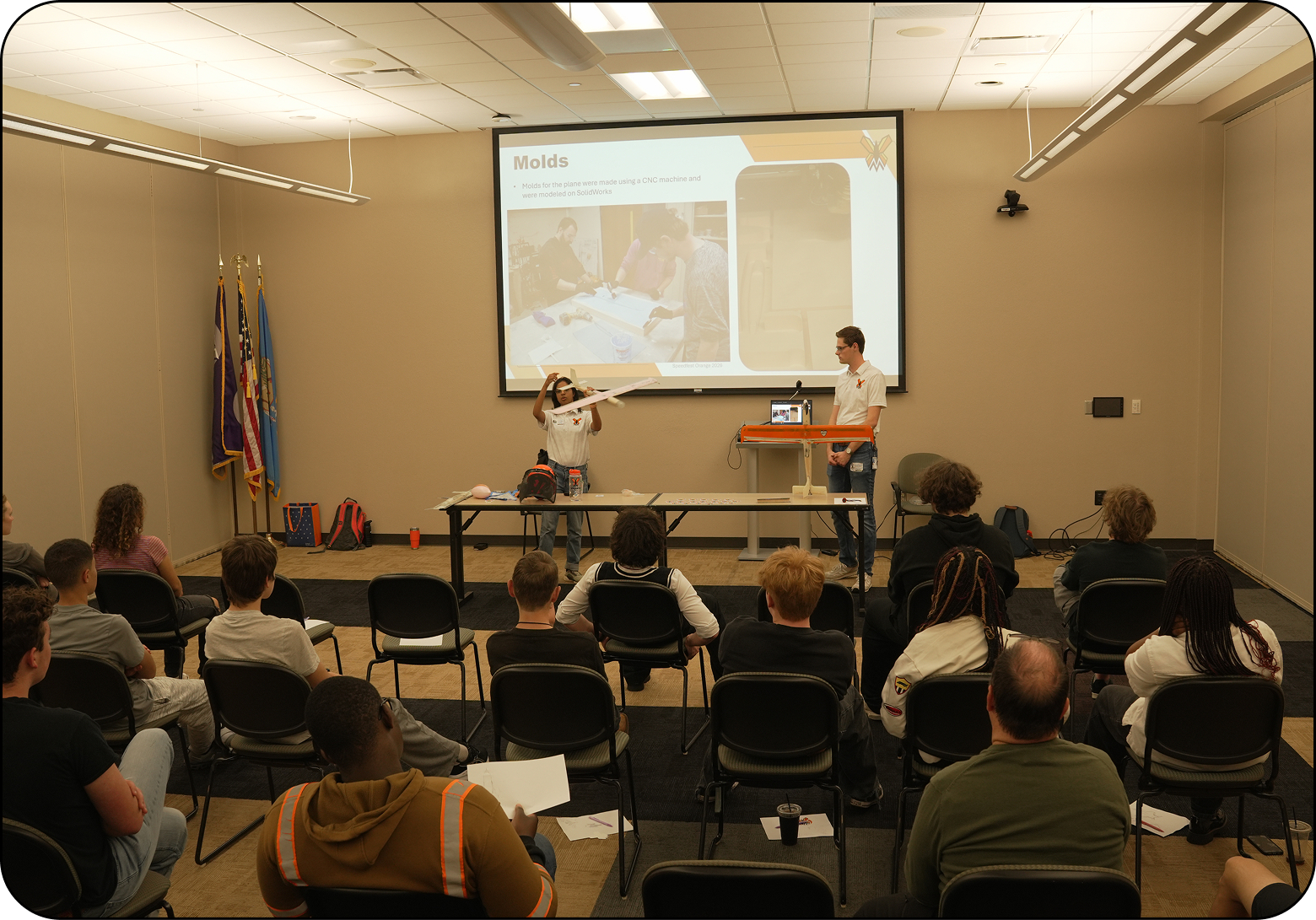 The design of Monarch was presented off-campus at Sequoyah Middle School, Meridian Technology Center, Francis Tuttle Technology Center, and the AIAA Region 4 Student Conference at Rice University. The Monarch team presented on OSU’s campus in Parker Hall, and the Applied Aerodynamics Class!